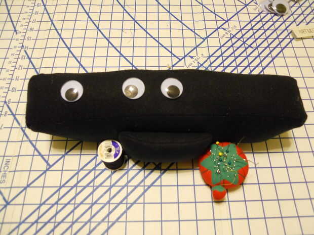 Luego, planificar la colocación de ojos de su Señor. Utilice una pistola de pegamento caliente para fijar los ojos. Presione cada uno mientras que el pegamento es de enfriamiento para obtener una buena adherencia. No se olvide de anclaje otra vez algo para que no caiga mientras pegue. Eso es lo que están haciendo el alfiletero y un carrete de hilo en mi foto.
