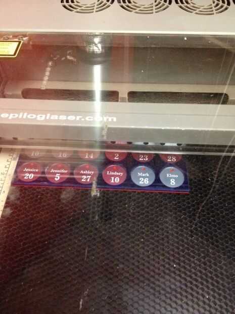 Una vez que tuve todos los nombres y día del mes creado en un archivo para mis etiquetas de círculo (azul para hombre, color de rosa para mujer) cogí la plantilla de etiqueta de círculo y al láserles.
