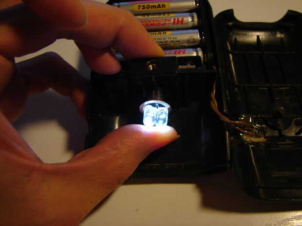 Cuando se utiliza un LED blanco, el método más fácil de conducir, es una conexión en serie con una resistencia de derivación. Trabajando en valores típicos para un LED de 5mm blanco.