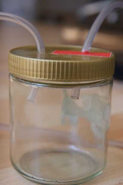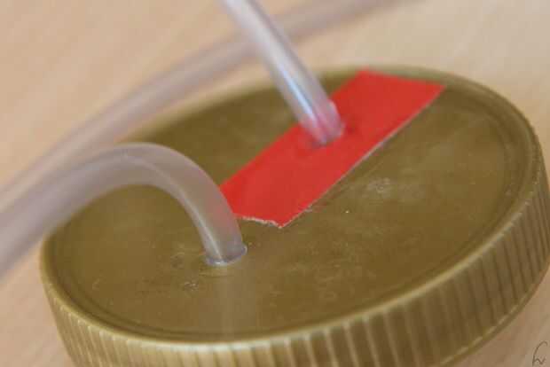 Conseguir un frasco. El mio es un tarro de miel con un vaso de plástico. Perfore dos agujeros. El diámetro debe ser un poco más pequeño y el diámetro exterior del tubo. Después de que en el extremo del tubo de la placa giratoria en un agujero y el extremo de otra pieza de tubo en el otro. La longitud del tubo de la placa giratoria no debe ser demasiado largo. No se se tensa demasiado. El otro trozo de tubo debe ser lo suficientemente largos, así que usted puede manejar el tubo insertado en el cono de la aspiradora sin tener que pagar tal mucha atención.