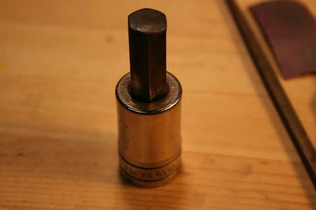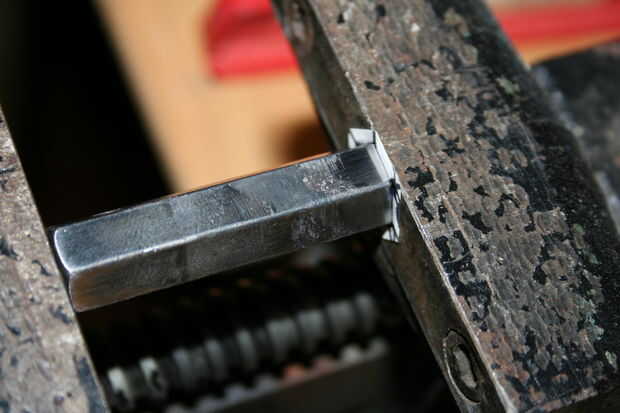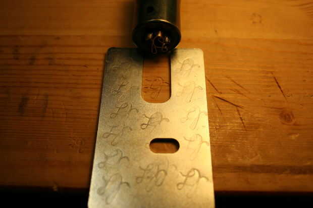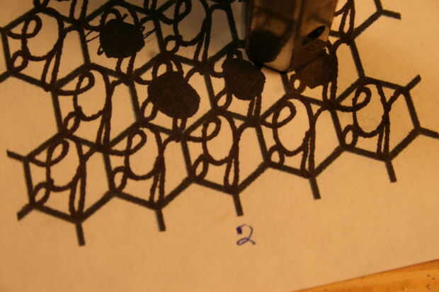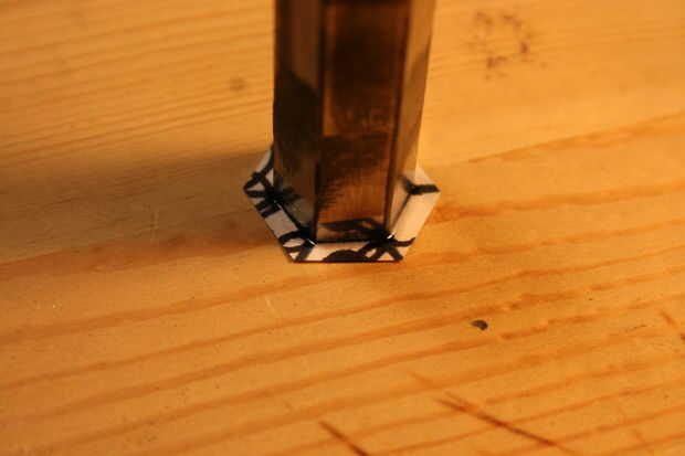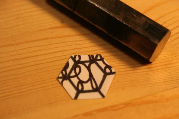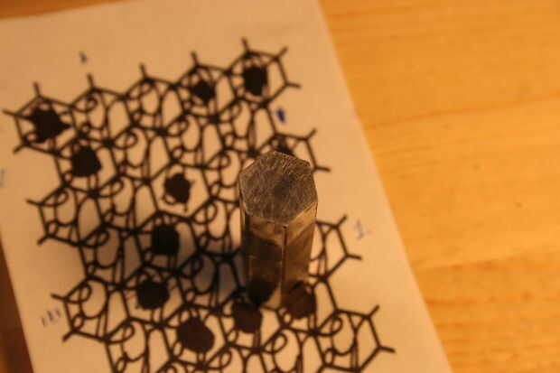 por sugerencia de mi sobrino, me decidí a hacer mi propio sello distintivo. Creo que alguien que hace cosas que debe tener una marca de algún tipo, para identificar como el fabricante. He utilizado una derivación de mis iniciales para marcar algunos artículos que he hecho en el pasado usando la tinta (mayoría de los artículos no llevan ninguna marca); tiempo para probar algo permanente y tallar de acero, en forma de estampilla! Quería ser dura y durable, por lo que he seleccionado una herramienta raramente usada para el trabajo, una llave hexagonal forma el proyecto de ley muy bien (mejor es acero de herramienta, creo). En primer lugar necesitaba un patrón, por lo que impreso un patrón de panal que encontré en línea, que luego escalan para adaptarse a mi 1/2" hexagonal. Entonces hice mi marca un número de veces para encontrar un patrón que encuentra conveniente y cinco de los seis puntos disponibles utilizar la tecla. Luego recórtalo, aplica pegamento súper y afianzado con abrazadera firmemente en la prensa para secar. Mientras se secaba calienta el extremo de la llave a más allá de su ' punto magnética (temperatura de transformación), con un soplete de propano apoyado dentro de una especie de horno de aislamiento de fibra de vidrio que tenía el papel de fuera (ser muy cuidadoso haciendo cosas como esta en casa, aunque la fibra de vidrio no quema se derretirá si la llama es que inciden en él y hay vapores tóxicos liberados así!) Esto se hace con un extractor que humos al aire libre. El acero debe ser calentada hasta un imán no se pegará a ella (alrededor de 1600 grados F dependiendo de la aleación utilizada), y luego la pieza estaba envuelto en el recinto de fibra de vidrio para enfriado muy lentamente para efectivamente lo recuecen. Después de recocer se comprobó con un archivo, para ver si es lo suficientemente suave como para cortar con el archivo. Más adelante fotos de volver a endurecer la pieza son las mismas que sería imagen de recocido. (Las fotos no muestran mucho, en este caso las palabras le dirá más acerca de lo que está ocurriendo).