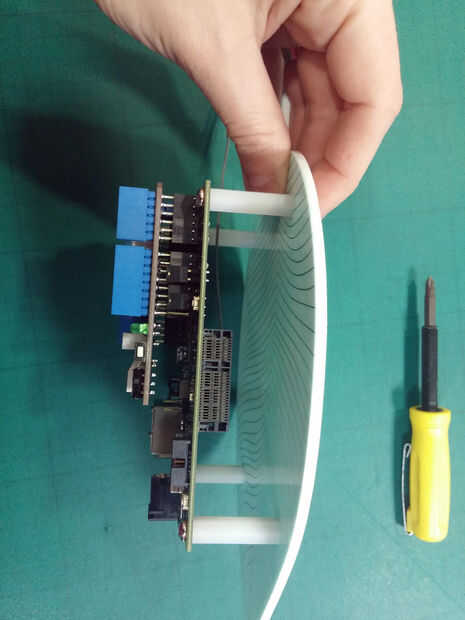 A continuación, atornille el blanco montaje bloques en su lugar por debajo de la Galileo. Utilice un tornillo en cada esquina de la Galileo y un tornillo en cada esquina de la unidad base de la hoja según imágenes tres y cuatro.