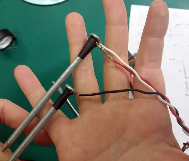 A continuación, tome el extremo de la resistencia de envolver éste alrededor de la uña misma como el cable blanco y asegure ambos clavos con cinta aislante, como se ve en la imagen dos.