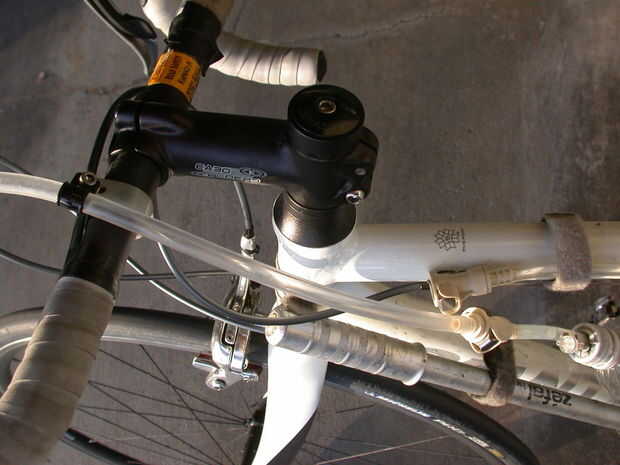 4. Ponga una abrazadera de cable de 1/4 alrededor del tubo de drenaje y colóquelo sobre el manillar. Coloque una abrazadera de cable más grande alrededor del manillar y conectar el dos abrazaderas con un tornillo. Puede que desee utilizar un pedazo de tubo interno para mantener el cable más grande pinza resbale en la barra. Una vez fijado el tubo de drenaje, puede retirar el tubo de ida y vuelta a través de la abrazadera del cable para ajustar la longitud.