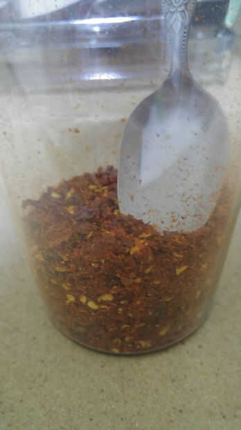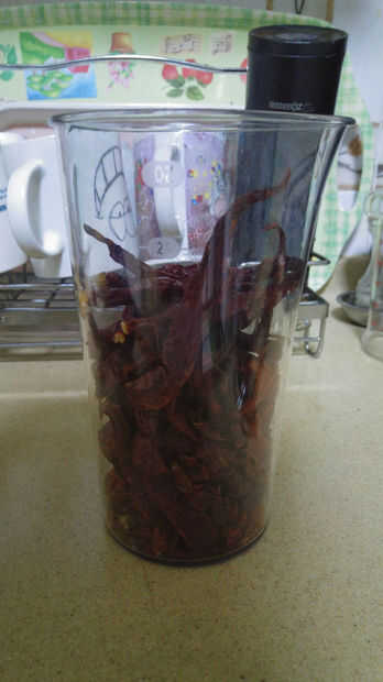 Mezcle los chiles en hojuelas finas con la batidora. Mezcle suficiente chiles para rellenar la mitad de la botella de Snapple