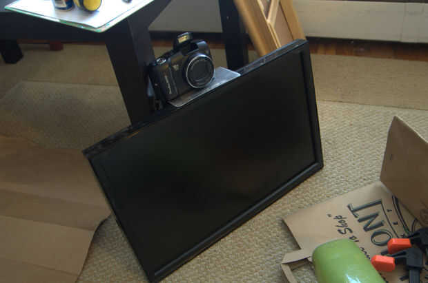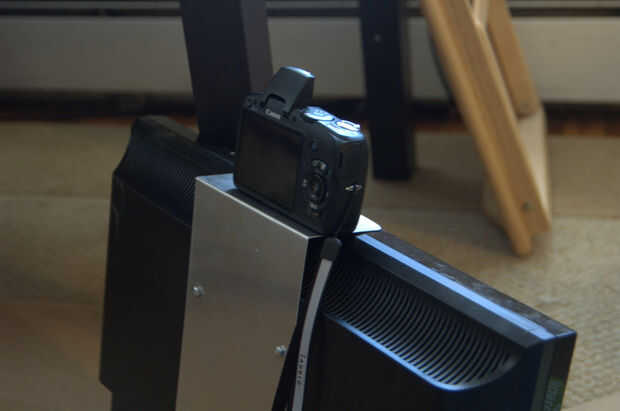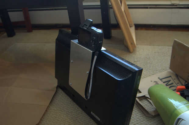 Doblar la hoja de metal en algún momento. Taladre un agujero para el montaje de la cámara. Ponga un tornillo de 1/4" a través de todo y atorníllelo en la cámara. Probablemente necesitarás una 1/4" tuerca en el tornillo (no el lado de la cámara) como separador, ya que normalmente no encuentra tornillos 1/4" lo suficientemente corto como para esto. La firma de la cámara del tornillo, pero no se rompen los hilos de rosca. Si el tornillo esté apretado y la cámara está suelta o aún queda espacio entre la cámara y la hoja de metal, entonces el tornillo es demasiado larga: obtener arandelas o tuercas espaciadores como más. No rompa la cámara.