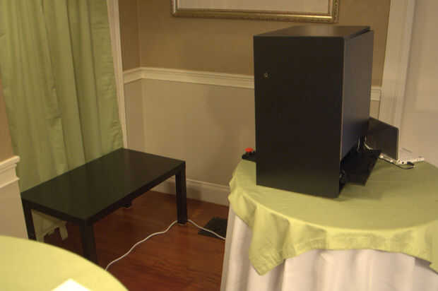 Tienes tu nuevo mini-photobooth setup y listo. Ahora necesita una tabla para poner en. También necesitarás un banco o asiento de algún tipo (utilizamos una mesa de centro Ikea falta como un banco - obras perfectamente!).
