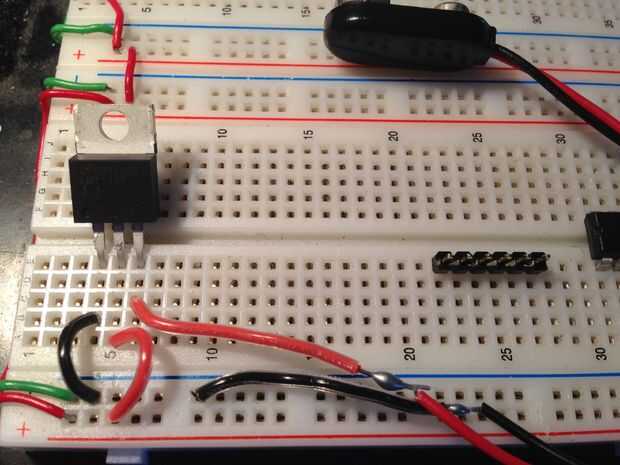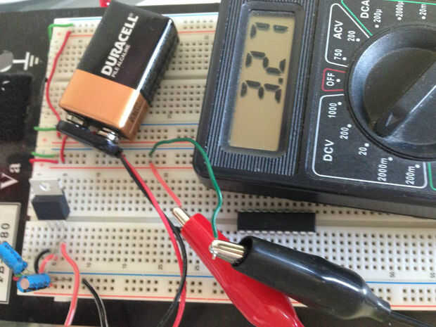 Ahora es el momento para comprobar la corriente para todo el tablero. Si hay problemas, mejor trabajamos les hacia fuera antes de añadir (y, quizás, freír) nuestro microcontrolador. La lectura debe estar en algún lugar alrededor de 3.3 voltios.