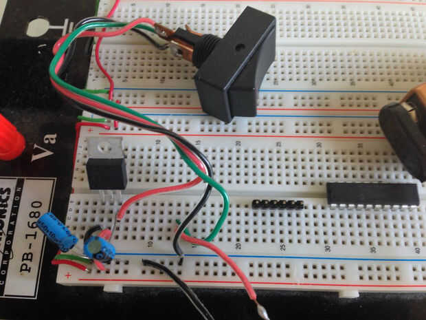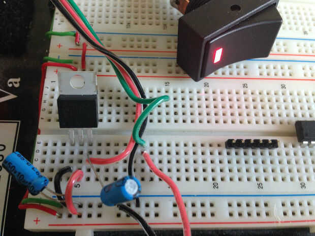En este caso, las conexiones van desde la carga hasta el resultado si enciende, y el tercero va a tierra (para el LED incluido). En la imagen, el cable verde proviene de la carga de la batería, y el rojo va directamente en el regulador de voltaje, que finalmente alimenta el tablero.