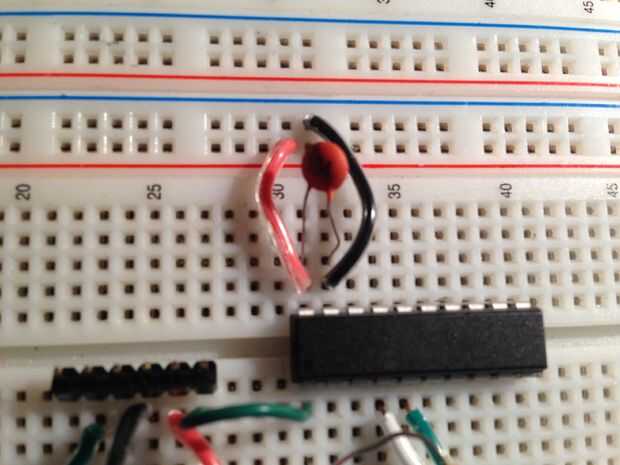 En nuestro caso, una de las cosas que necesitamos de él es en la página 23. Pernos todos VDD y VSS para el cerebro deben estar conectados y disociada (ver paso anterior). En esencia, esto significa que todos ellos necesitan estar conectados a tierra y tensión de la Junta (este chip no puede pasar de 3.3volts) y todas las parejas deben tener tapas (eso es lo que todos los profesionales dicen, creo, para los condensadores?) para suavizar la corriente. Cerebros no gustan picos; Pensemos en picos en términos de una resaca... Resulta que, nuestro chip de PIC24F16 sólo tiene un par de energía y tierra. Que permite añade un 0.1uF cap entre los pines los chips 19 y 20. Debemos mantener estas cerca del chip, como todos los buenos enemigos. 0.1uF casquillos generalmente no son polarizados, por lo que no importa que la pierna va donde. Siempre y cuando horcajadas pins del chip agradables y cercanas.