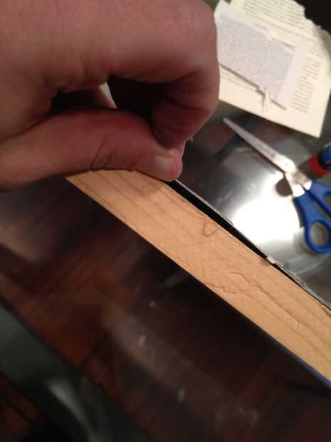 Aplicar pegamento en los bordes y colocar algo pesado sobre él para que sea establecido por unas horas. No quiero sacar mis dedos todos usé palillos de chop que encontré en la cocina para aplicar el pegamento.