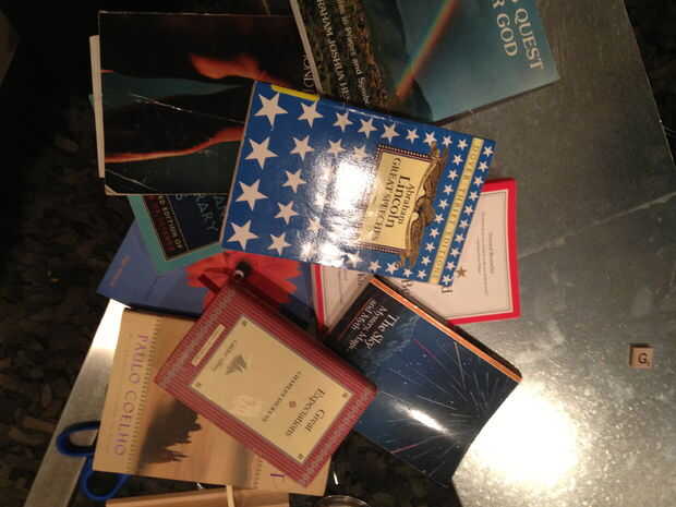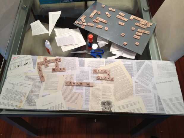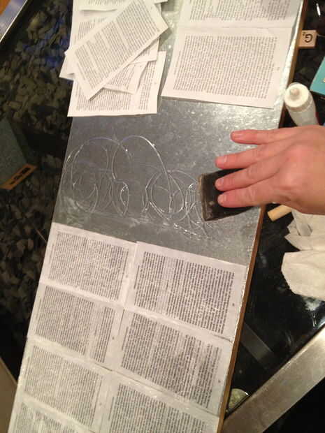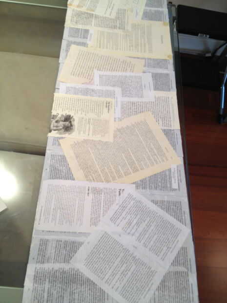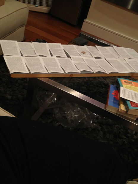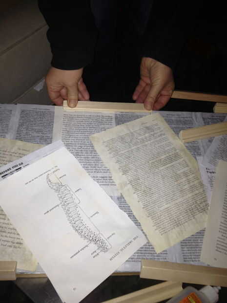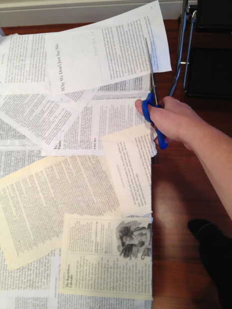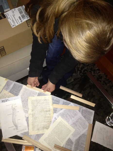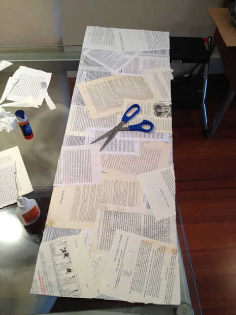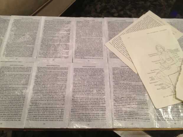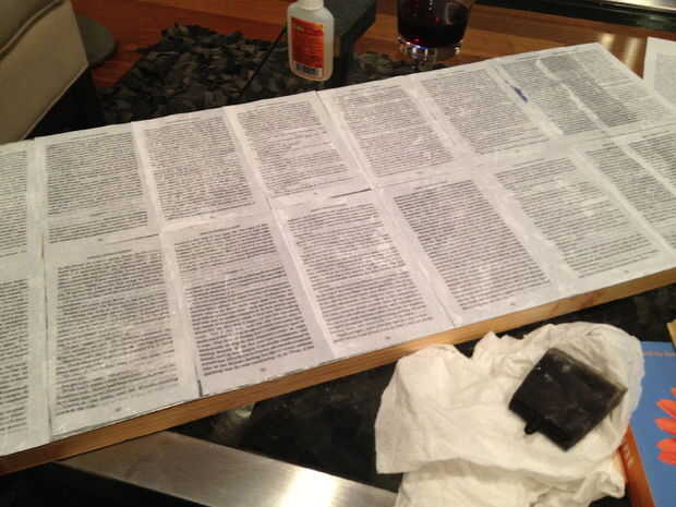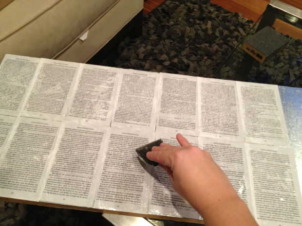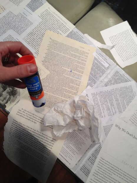 pasé una noche en una tienda de libros usados decidir sobre mi tema de collage de fondo. He decidido centrar las páginas del libro seleccionado en la esquina literaria de la ciencia y la religión. Cogí unos libros y luego arrancó una docena de páginas para aplicar a la chapa. Puso hacia fuera y entonces me puse sobre la aplicación de la cola y las dos capas de papel para hacer la base. Luego utilicé una esponja ligeramente húmeda para ir sobre el papel para hacer extra suave.