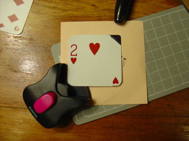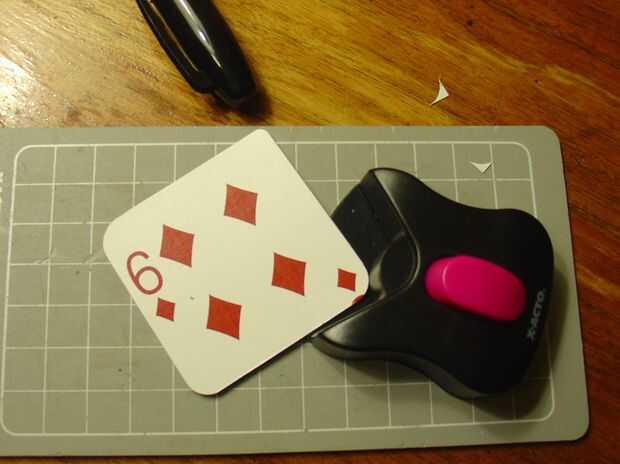 Usando el barbero de la esquina, redondo todo pero una de las esquinas de la tarjeta.  Deje el último borde en su original forma para marcar "A la esquina".  Este rincón también puede marcarse con un marcador permanente.  (Esto hace más fácil decir dónde está el punto de partida mientras que tejen.)  Deje que el marcador se seque por un momento antes de continuar - tinta permanente aún no se pega como en la brillante superficie de la tarjeta.