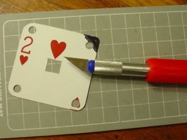 Corte un agujero cuadrado en el centro de la tableta con un cuchillo.  Esto le permite vincular las tarjetas cuando no tejer, o para ejecutar un cable extra a través del centro para la fuerza adicional.
