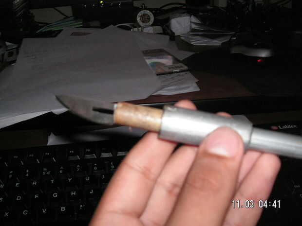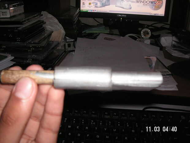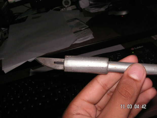 Tomar el tubo y ponerlo alrededor del bambú. Hacer una incisión en la parte superior del bambú. Inserte la hoja en la incisión. Entonces, finalmente, ponga el tubo alrededor de la hoja. Pintar en plata (hace más real) o de cualquier color que desee. Aquí tienes. Su propio cuchillo x-acto.