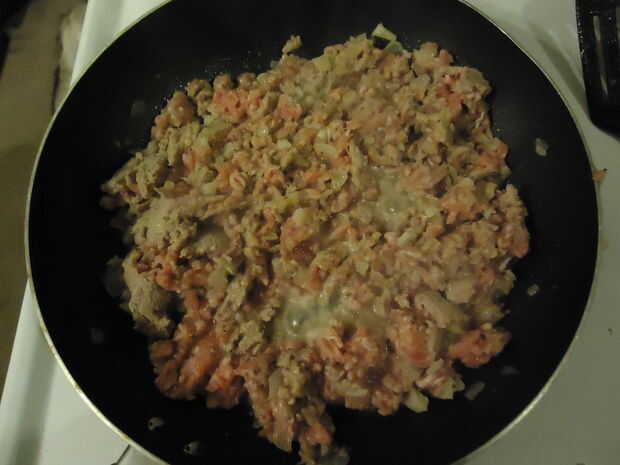 Después de haber cocinado la cebolla y el ajo toma mezcla la mitad de ella y poner y el pavo en una sartén. Cocine, ya que normalmente sería agregando cualquier especias te gusta.