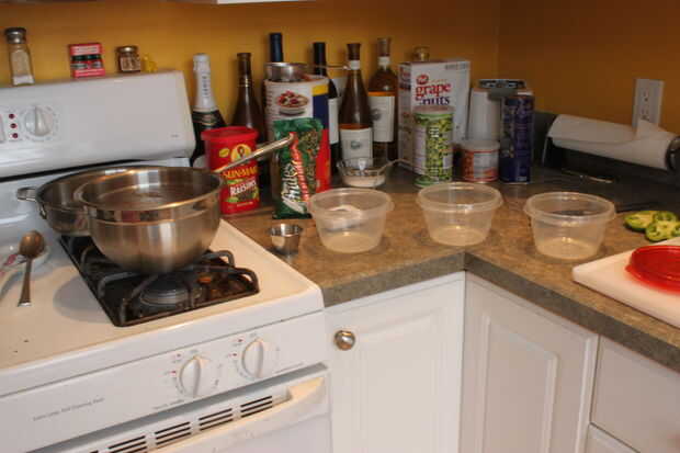 Bien, la comida se lleva a cabo. ¿Realmente no había que mucho, estaba allí? Ahora tenemos que este bateador enfriado a 40 grados F por poner en la nevera durante varias horas (o cualquier método escalofriante elige utilizar). No sé por qué pedí mi encantadora ayudante (/ novia) para verter del tazón de fuente en los envases finales en este punto. No sólo no era necesario, era una PITA , así que por favor, aprender de mis errores y poner el bol (uno que tiene la masa en ella ahora) en la nevera. Probablemente va a ser una buena idea para cubrir también. Como se puede ver, sino estaba tratando de intervenir y provocar una catástrofe de menor importancia. Tengo que decir sin embargo, fue una catástrofe deliciosos :) Además, no prestar atención al sándwich de queso y pimiento que estaba bajo construcción. O para el caso mi amado mando cacahuete de TIVO . Después de todo, le debo todos mis conocimientos culinarios (menos el queso) a Alton Brown y come bien. GRACIAS ALTON.