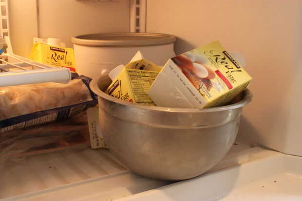Antes de llegar demasiado lejos, es tiempo para la preparación un poco. Es necesario conseguir ahora un tazón de metal de tamaño mediano en el congelador. Más adelante en este instructable, usted va ser verter crema caliente en esto, para ayudarle a enfriar que mucho más rápido. Esto también es un buen momento para asegurarse de que su cacharrito de fabricante de helado se congela real buena. Si no te pueden congelar en este momento sin agregar demasiado tiempo. Esto es así, porque la masa caliente (?) debe estar bien fría antes de proceder de todos modos. Esto toma varias horas, pero llegar al más tarde, sólo odio siguiendo una receta y encontrando un oculto "espera 200 días y..." en allí.