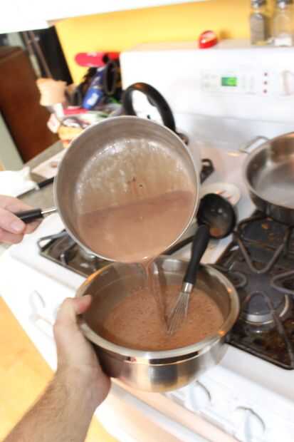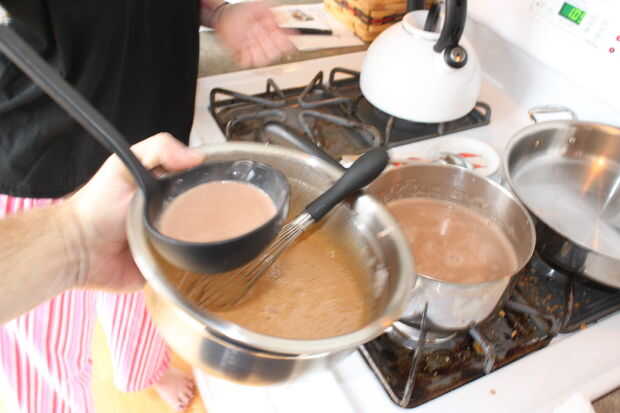Una vez que su leche ha llegado a hervir pelado (unas burbujas que aparecen a lo largo del borde exterior de la cacerola) es hora de combinar los productos lácteos y los huevos. En primer lugar, apagar el fuego! No dejes que ese tipo de cosas hervir. Te huele mal y peor gusto. El truco aquí es bastante simple. Si usted solo descarga uno en el otro, vas a terminar con una cosa... Huevos estrellados. O en este caso, Chocolate con sabor a huevos revueltos. Ahora lo reconozco, eso suena interesante, pero eso es no lo que estoy tratando de enseñarle a hacer, ¿es? Qué vas a hacer se llaman "Templar". Está agregando el material caliente (leche en este caso) a la materia capaz de cocinar (yemas) muy lentamente para evitar que el material caliente de la cocina de las otras cosas. ¿Dig? Lo que puedes hacer, es Búscate tu cucharón favorito y mezclar / batir la leche en la un cuchara huevo yemas completo en un tiempo (el primero que utilizo un medio cucharón completo). Hacer esto tipo de poco a poco, la idea es enfriar la leche con los huevos (o calentar los huevos con la leche. (No encanta termodinámica!) Mantenerla hasta que has usado hasta un tercio de sus productos lácteos. En ese momento es probablemente seguro seguir adelante y vierta el resto de la leche en los huevos. Si eres como yo, entonces este es el punto donde la planificación ha fallado un poco y tendrás que encontrar una manera de obtener la masa (es lo que se llama en este momento?) en su cacerola. Eso es porque vamos a volver a algo de calor en él ahora que casi todos los ingredientes están allí (azúcar, huevos y lácteos).