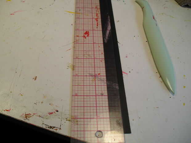Use el negro tiras estrechas para terminar los bordes superiores de la cartulina expuesta. Cortar estas tiras en 3/4 de pulgada, luego marcar dos líneas que son exectly la anchura como el cartón. Las dos líneas son lugar en el centro de la franja de modo que cuando se pliega, la pieza será el mismo en el interior y el exterior de la caja. Ver fotos de esquina corte y plegado de detalles.