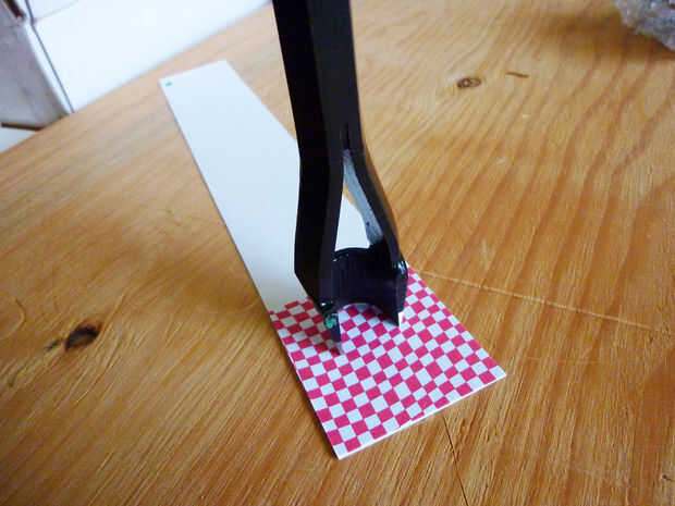 Desde que no estás usando un golpe, nada práctico usar para crear un esquema de ficha con un lápiz de luz. Como referencia una moneda de diez centavos es sólo de 11/16" de ancho (un poco más grande que 5/8"). Un penique es aproximadamente 3/4" de diámetro. Utilice un borde recto para completar los lados izquierdo y derecho de la silueta de la forma de "U" y utilice su cuchillo X-acto para cortar a través del esquema.