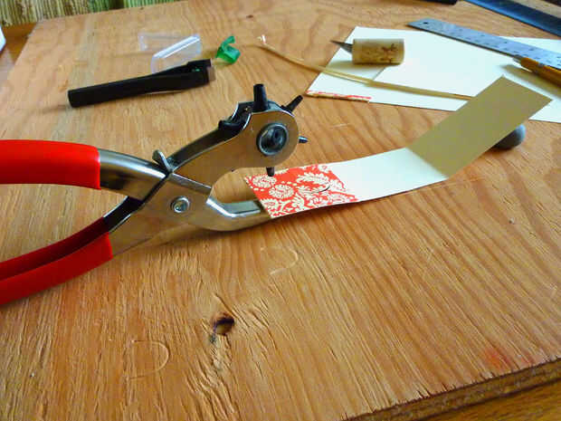 Ahora necesitamos una manera elegante de fijar la etiqueta al regalo. Usé un sacador de cuero de tamaño variable que tuve que crear un agujero pequeño (3/16") cerca del final de la etiqueta del regalo.