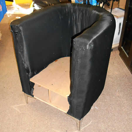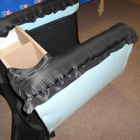 4. la tela de la guarnición fue cortada para caber sobre las secciones delanteras de ambos lados, con un montón de tela sobrante en el superior, inferior y lados para sujetar con grapa al marco de la silla. Asegúrese de pulsar la grapadora o engrapadora abajo muy difícil penetrar en la madera por debajo de la espuma.