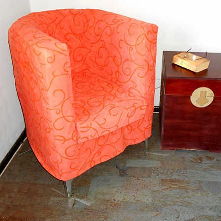 5. Envuelva la parte principal de la silla de corte 3 secciones de la tela de forro lo suficiente engrape a la base del asiento, abrigo sobre los brazos y de la grapa por debajo de la base. Grapar la parte posterior en el lugar primero y luego añadir las secciones laterales, superposición de las secciones. Asegúrate de doblar bajo la tela en ambos extremos (en la base del asiento y debajo de la base) para evitar desgarros y utilice un arreglo escalonado de grapas. No olvide que puede utilizar las tiras finas de bateo para llenar en donde hay grapas.