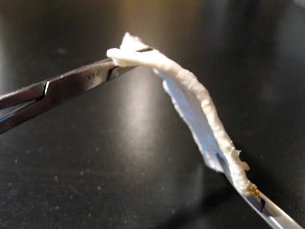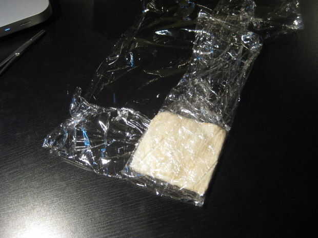 Simplemente estirar de pie ~ 1 de envoltura de alimentos y coloque la venda cerca pero no en la esquina. Doblar como se muestra en las fotos. Presione firmemente para purgar el aire cada vez se hace un doblez.