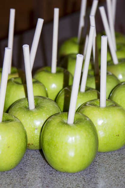 Primero retire el tallo de tus manzanas y pelar apagado las etiquetas (ver primera foto). Luego tienes que lavar bien y séquelos. Ahora están dispuestos a dejar los palillos en la parte superior. Usted puede comprar palos preparados nos encontramos con nuestro en Walmart en la torta que adorna la sección (ver segunda foto). O usted puede hacer su propia comprando tacos sobre el mismo diámetro que un lápiz. Simplemente corte las espigas en trozos de 6 pulgadas y afinar un extremo. Previamente puede empapar el filo de los tacos en jugo de limón si desea. No es obligatorio pero mantiene la manzana gire marrón alrededor de la espiga y se ve un poco mejor cuando se corta para comer. Poner los palillos en las manzanas lleva una mano fuerte. Use una toalla de plato para ayudar a sostener la manzana y proteger su mano empujando en el palo (ver tercera foto). Empuje en como estrecho como sea posible y cerca de 2 pulgadas en la manzana (ver adelante foto). Si usted no consigue en mucho lo suficiente la manzana caiga al poner sobre el caramelo y el chocolate.