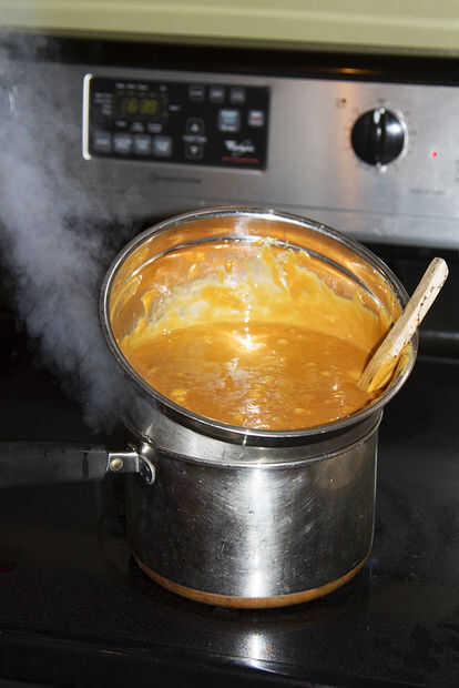 Desenvuelva los caramelos (ver primera foto), usted necesitará el bolso entero así que si quieres algunos snack a estar seguro para comprar y bolsa extra :) Colocar en un baño María con 1 cucharada de agua, esta mi varían en función del área usted vivo en. Para nuestro baño María solo utilizamos una cacerola regular con una taza de metal en la parte superior (ver segunda foto). La forma de un tazón de fuente es mejor para la inmersión de una caldera doble regular. Puede que necesite experimentar con la cantidad de agua que pones en el tuyo. Sé que la bolsa sugiere 2 cucharadas pero hemos encontrado para nuestra zona del país que 1 T. había trabajado mejor y mantuvo el caramelo en una consistencia mejor si usted consigue el caramelo demasiado fina que no se deslice la manzana. (Vivimos en un clima seco de altura). Calentar a fuego medio, revolver de vez en cuando así que calientan uniformemente pero no demasiado o se hacen burbujas en el caramelo. Una vez que el caramelo se reduce a un líquido que es fácil trabajar con es tiempo para mojar tus manzanas.