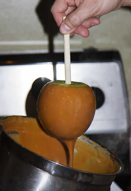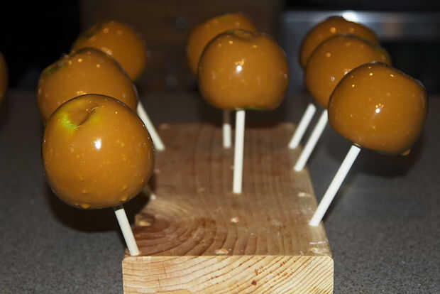La manzana de la inmersión y hasta que todos los de la manzana está cubierto excepto la parte superior cerca del palo. Ahora tire hacia arriba y dejar que todos el caramelo sobrante a escurrir nuevamente dentro de la bandeja (ver tercera foto). Esto toma aproximadamente 30 segundos. Una vez que el caramelo es lo suficientemente delgado utilice una pequeña espátula para quitar el exceso de la parte inferior. Gire y agite para suavizar la parte inferior. Es importante que sólo una fina capa de caramelo, por un lado su apple no se verá tan bonita y otra es que no tienes suficiente caramelo para cubrir tus manzanas. Ahora que la manzana está cubierta es momento de ponerla en la bandeja de enfriamiento que hizo. Colocar la manzana boca abajo se enfríe (ver foto cuarta). Esto también no es obligatorio también podría deje secar lado derecho para arriba en una hoja de papel de cera pero tiene una gran piscina de caramelo en el fondo y no parece tan bonitas. Queremos vaciar un estante en el refrigerador para poner el soporte de refrigeración hasta el fresco de manzanas más rápido o si es un día frío, entre 40-25 grados Fahrenheit también puede colocar al aire libre. PRECAUCIÓN no lo hace en el congelador o en un día realmente frío o las manzanas se enfría demasiado y se agrietará el caramelo o chocolate.
