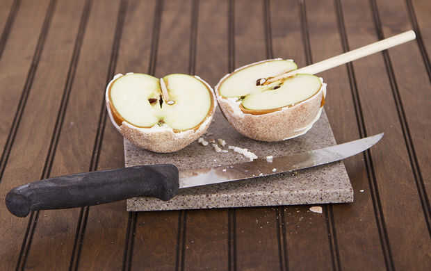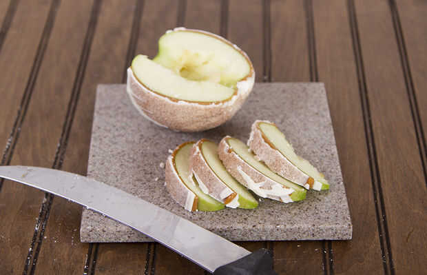 Una vez que están lo suficientemente calientes. Use un cuchillo grande para cortar la manzana por la mitad. Base de la manzana. Ahora puede cortar la manzana en rodajas, trabajando su camino alrededor de cada mitad. Sólo cortar tantas como se quieran comer al tiempo. Las manzanas se dore y no vea tan bien. Las partes sólo corté un par manzanas en un momento y luego cuando desaparecen casi las rebanadas voy a empezar a cortar un par más.
