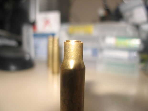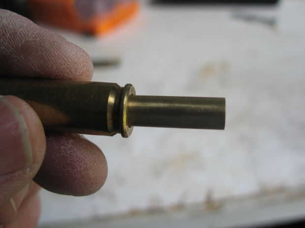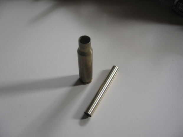 Envuélvalo con cinta un extremo unsquared del tubo. La cinta debe ser suficiente para pasar a través del cuello del cartucho sin ninguna holgura. Debe ser una empresa de ajuste pero no apretado. El borde de la cinta debe ser aproximadamente 3 mm desde el extremo abierto del cuello. Usé cinta aislante, 2-2.5 capas. Entonces usé cinta adhesiva clara para el ajuste final es mucho más fino. Que tenga que hacer algunos ajustes para cada espacio en blanco como diámetro de cuello puede variar ligeramente.