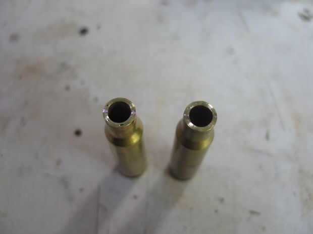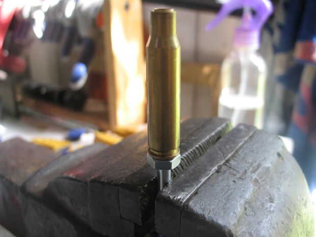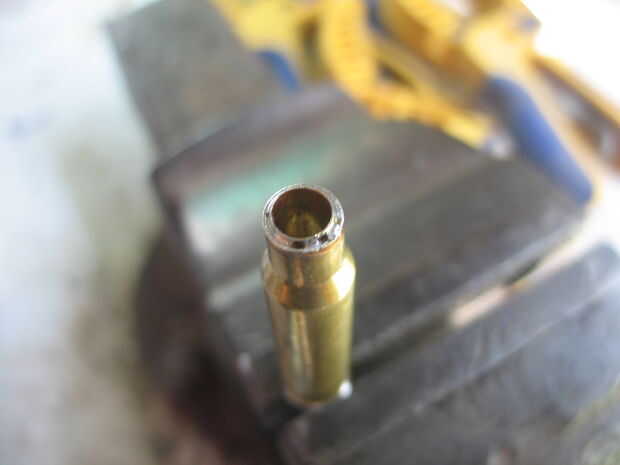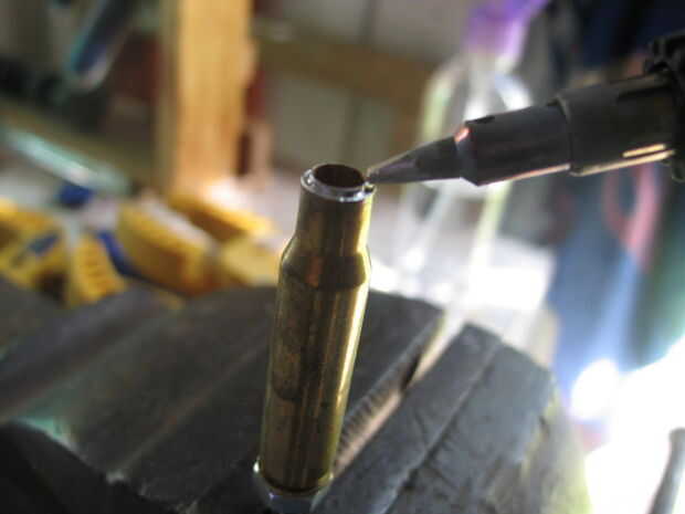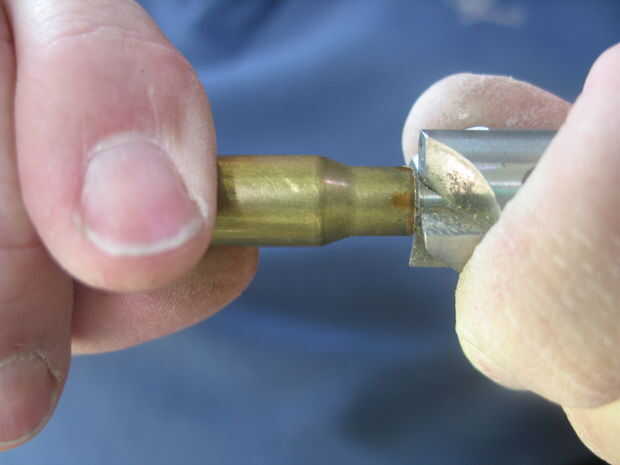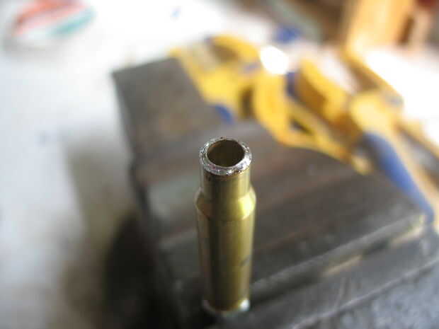 Una vez se haya enfriado toma el cartucho fuera de la arena y el tornillo o presentar el tubo de 7mm hasta que quede casi al ras con el cuello del cartucho. Si tienes cualquier soldadura en el exterior del cartucho, utilice un papel de lija de 800 a la arena de la soldadura. No te preocupes los arañazos, que serán pulidos hacia fuera. Utilizar el molino de pluma para cuadrar al final del cuello, otra vez lo puedes hacer a mano como el latón y soldadura son suave, sólo no quitar demasiado. Parada cuando el cuello de tubo, la soldadura y el cartucho de 7mm son planas y brillantes todo el camino alrededor. No te preocupes cualquier huecos en la soldadura.