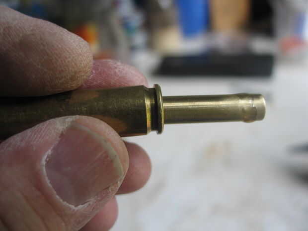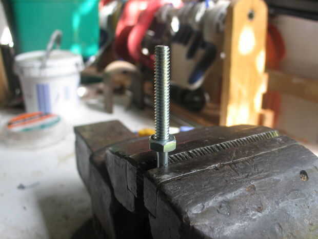 Para sostener el cartucho me sujeta un 3" largo 1/4" tornillo en un tornillo de banco y colocar en la parte inferior de la rosca de una tuerca de 1/4". Luego puse el cartucho sobre el perno, de cuello. Esto da apoyo sin necesidad de sacar el calor del proceso de soldado. El cartucho puede rotar sobre el tornillo cuando se aplica el soldador, esto puede ser útil si tu plancha no calienta el tubo y el cuello todo el camino alrededor. Se puede simplemente "caminar" la punta del cautín alrededor del tubo. De lo contrario algunas cintas en la parte inferior deben tener suficiente tiempo.