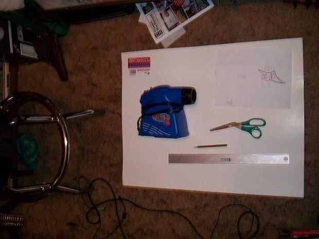 1 regla 2, lápiz 3 papel de carbón 4 proyector de arte 5 cartulina 6 imagen de la guitarra realizada, sitios web de distribuidor de música son una fuente libre, Photobucket etc.. 7 negro rotulador o marcador 8 chinchetas