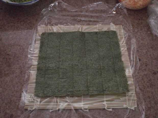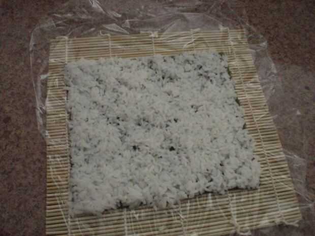 tomar su estera de bambú y cubra con envoltura plástica. luego coloque una hoja de nori en él para que los lados loger paralelas a la bambú. Asegúrese de que el lado rugoso es hacia arriba. tomar de una taza o un arroz y coloque sobre el nori, trabajar para que cubre totalmente con una capa delgada de arroz y pulse en. no presione demasiado duro.