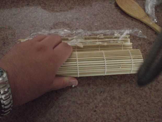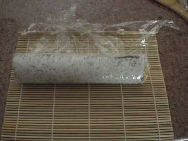 tomar su estera y empiezan a rodar sobre el nori en los rellenos. al llegar todo el camino alrededor, levante el borde y el resto de la forma del rodillo. Aplique una presión firme al rollo con el tapete, pero no apretar a muerte. luego transferir el rollo a una tabla de cortar. Añadir unas semillas de sésamo si tienes, o a algunos tobiko.