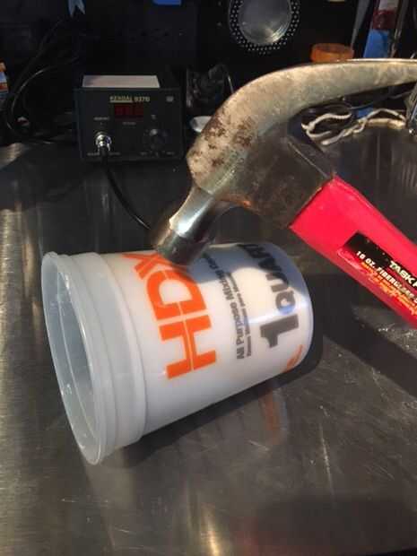 Envuelve la... lo que yo llamo esta cosa... Tarjeta de regalo vaso??? en espuma de poliestireno y en un par de gafas de seguridad (tienes que éstos, como chips de poco va a volar). Finalmente envuelto este regalo en una caja llana, utiliza cinta de pintor (para color) y grabó su nuevo martillo hacia el exterior de la caja.