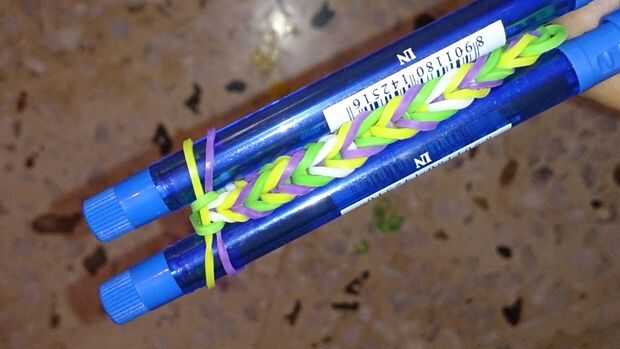 Poner dos bandas de telar recto en las plumas. Luego gire la primera banda en el medio. Añadir otro telar y repita los pasos anteriores. Seguir haciendo esto hasta que se convierte en el tamaño de tu mano
