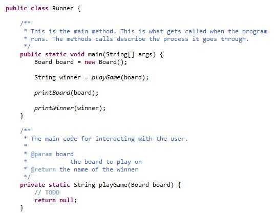 Cabeceras de método son la primera línea de los métodos. Describen lo que el método pretende hacer. Echemos un vistazo a privado estático String playGame(Board board)