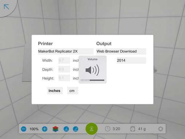 Para utilizar la primera opción, pulsa el icono de exportación en la esquina inferior izquierda de la bobina de Tinkerplay ajuste el tamaño de su modelo usando los controles previstos. (Yo prefiero usar el 100%) Pulse el botón verde. Ahora se le mostrará una dirección IP, un conjunto de 4 números separados por puntos. Intente introducir esto en un navegador en un ordenador que está conectado a la misma red que el dispositivo local, y usted debería ver una página que te permite descargar archivos .zip o .thing. Elige cualquiera de los dos y descargar en una ubicación conocida de su equipo.