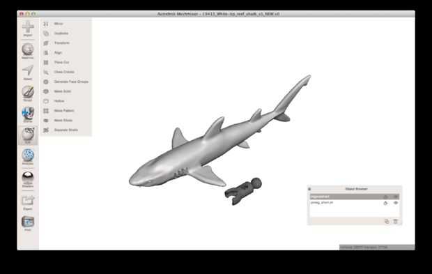 Seleccione el modelo de tiburón y haga clic en el icono que parece dos cuadrados superpuestos en el examinador de objetos. Ahora tienes una copia del tiburón a trabajar, dejando la original intacta. (Por cierto, esto no afecta el archivo descargado, solo las copias en Meshmixer.)