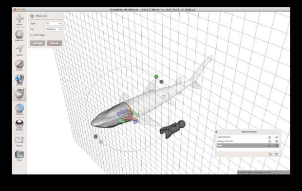 Usted desea haga clic en el icono Editar en el lado izquierdo y seleccionar plano de corte. Esto actúa como un cuchillo, cortar a través de su parte. Puede utilizar los arcos de colores para mover el plano de corte. Poner el cursor del ratón sobre las marcas que aparecen permite que moverse en incrementos precisos. Usted querrá el plano de corte sea perpendicular (a 90 grados) al cuerpo del tiburón, como en la imagen.