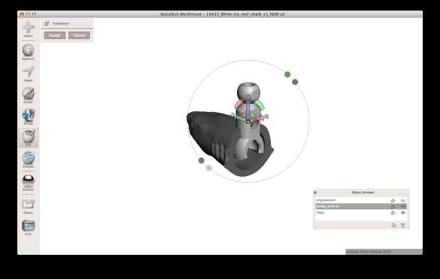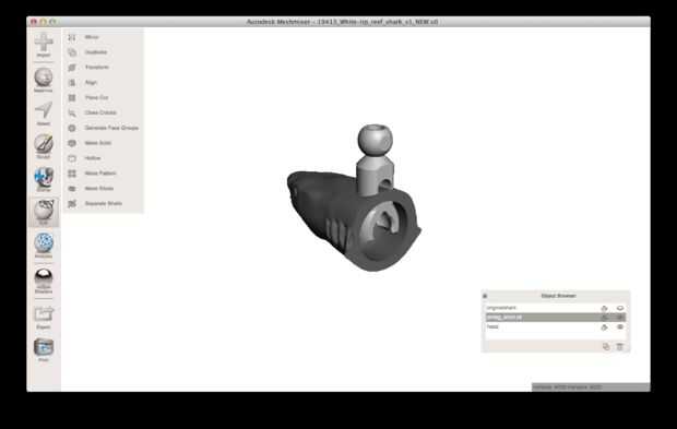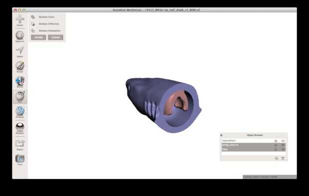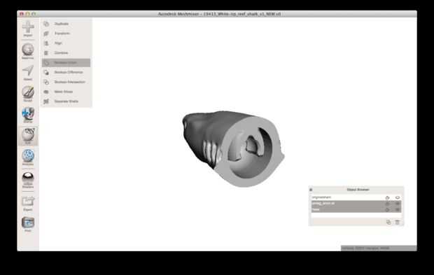 Una vez que hayas colocado el conector, utilice cortar de plano cortar la parte que se pega para arriba sobre el tiburón. Luego seleccione la cabeza del tiburón y el conector, haga clic en editar y booleana Unión y debe tener sus piezas combinados!