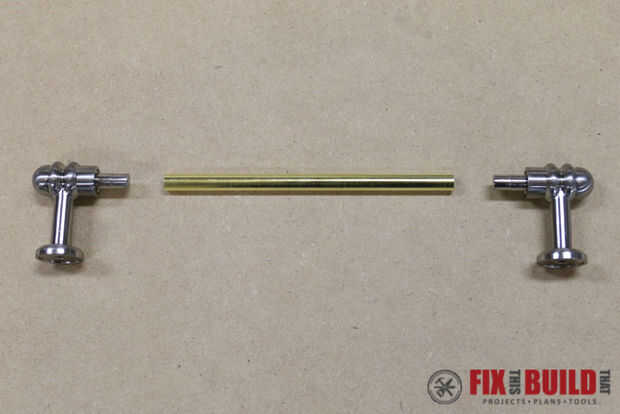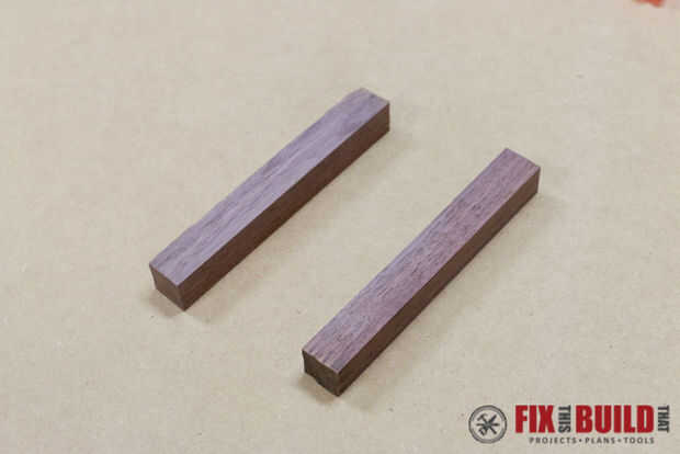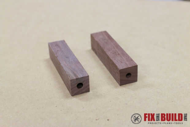 Usé la nuez por lo que correspondería con algunas otras partes de mi proyecto. Corté 2 espacios en blanco (para hacer 2 tira) 3/4 "x 3/4" y 5" de largo. Perfore un agujero de 10mm a través del centro de cada espacio en blanco. Usted puede hacer esto con una prensa del taladro o montado en su torno dependiendo de qué clase de equipo tienes.
