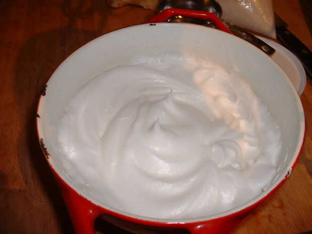 4. bata las claras con una pizca de sal hasta que formen picos. (Asegúrese de limpiar sus aspas antes de vencer a los blancos)