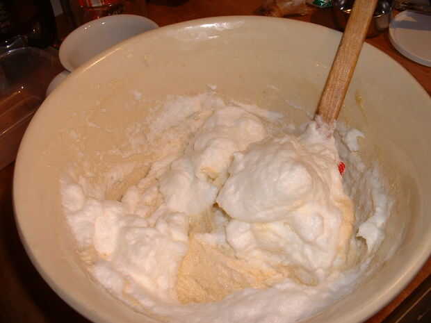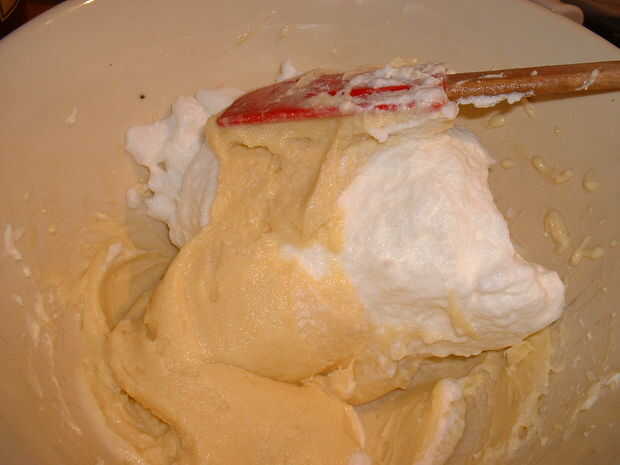 5. con cuidado doble los blancos a la mezcla de mascarpone/yema de huevo hasta que quede mezclado uniformemente.