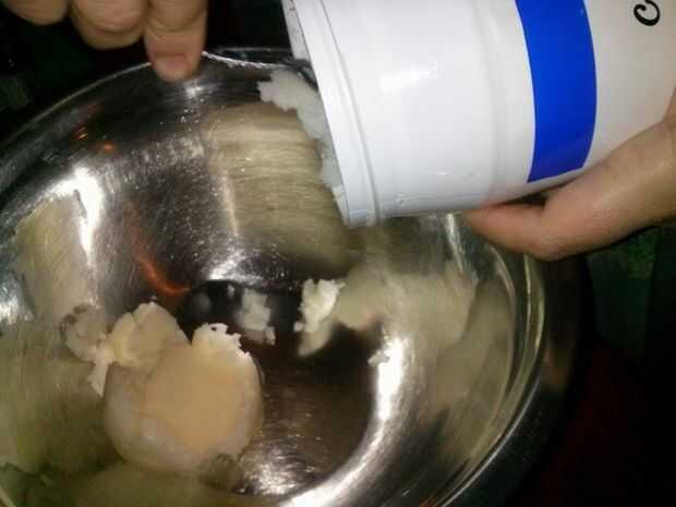 Pongo 2 cucharadas grandes de aceite de coco en el recipiente.
